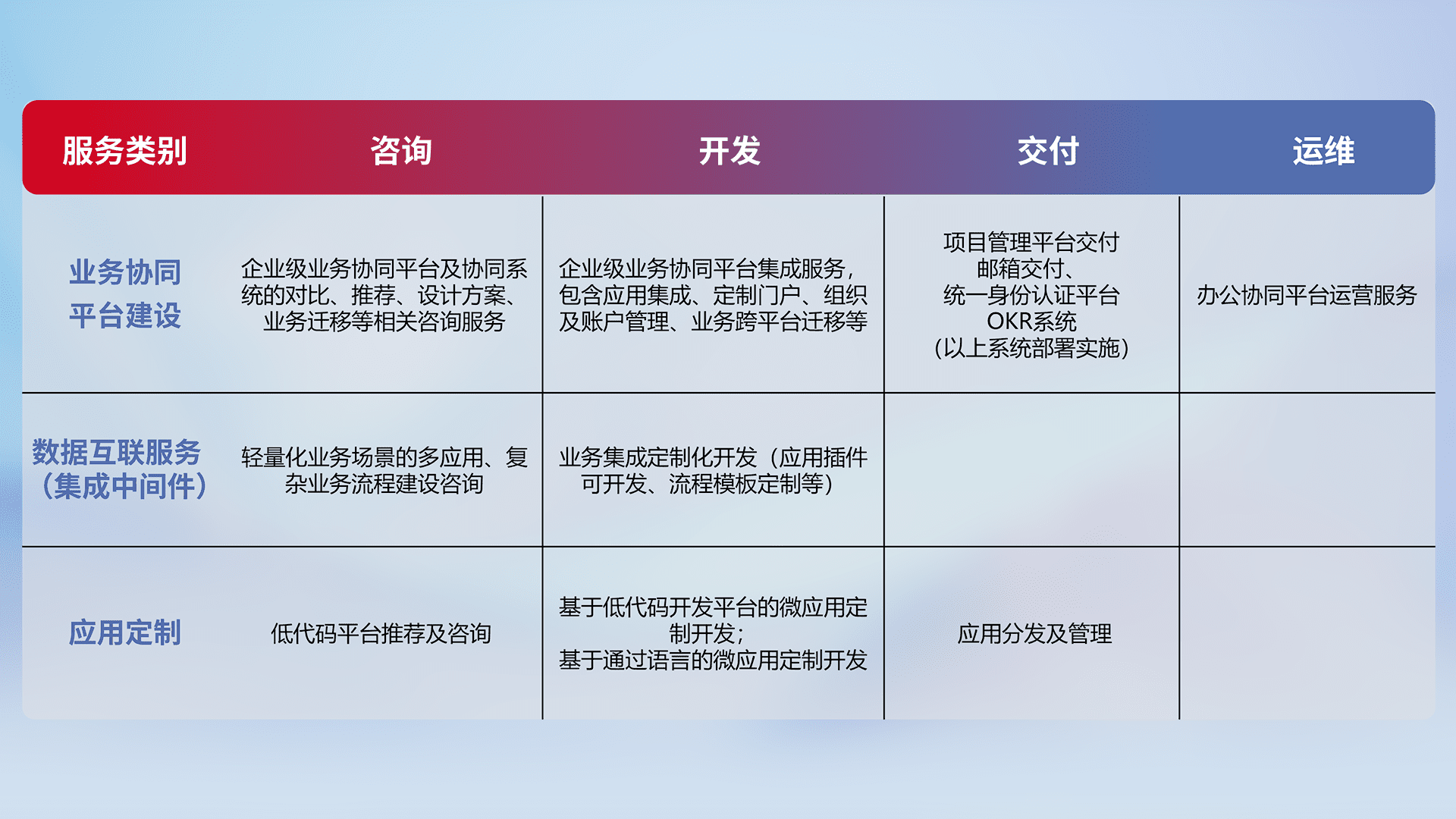 针对钉钉、、、企微、、IDaas等平台级产品提供产品的规划、、方案、、、、交付、、、、定制化开发等服务,,实现如统一协同办公、、、、智能客户服务、、、混合会议管理、、、、智能数据查询、、等业务场景,,,,实现数字化转型。。。