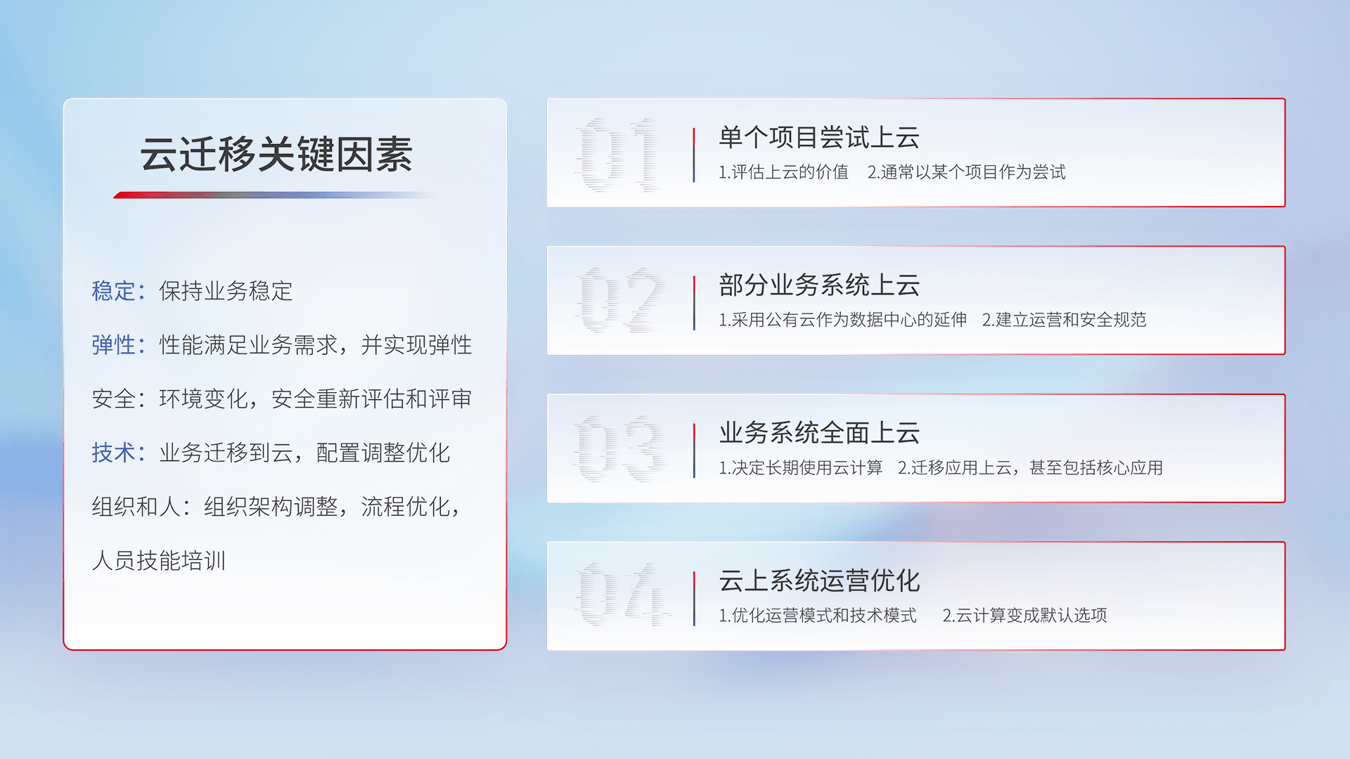 结合实际业务,,从规划设计、、云平台选型、、云原生改造、、、数据迁移、、、集成交付,,迁移全过程为客户识别最佳上云路径,,,,做好风险识别管理,,,,设计网络架构、、、、身份权限、、、、安全审计合规、、、、操作审计、、、、日志审计、、、监控告警策略、、、、多站点容灾设计等,,,对云上基础设施进行整体规划,,,提升IT治理水平,,,以满足弹性、、、高可用、、高性能的需求。。