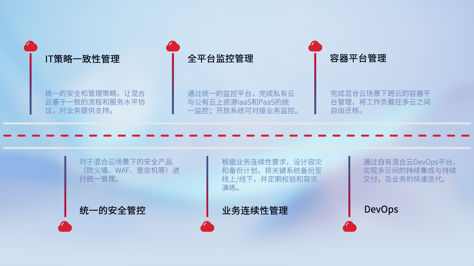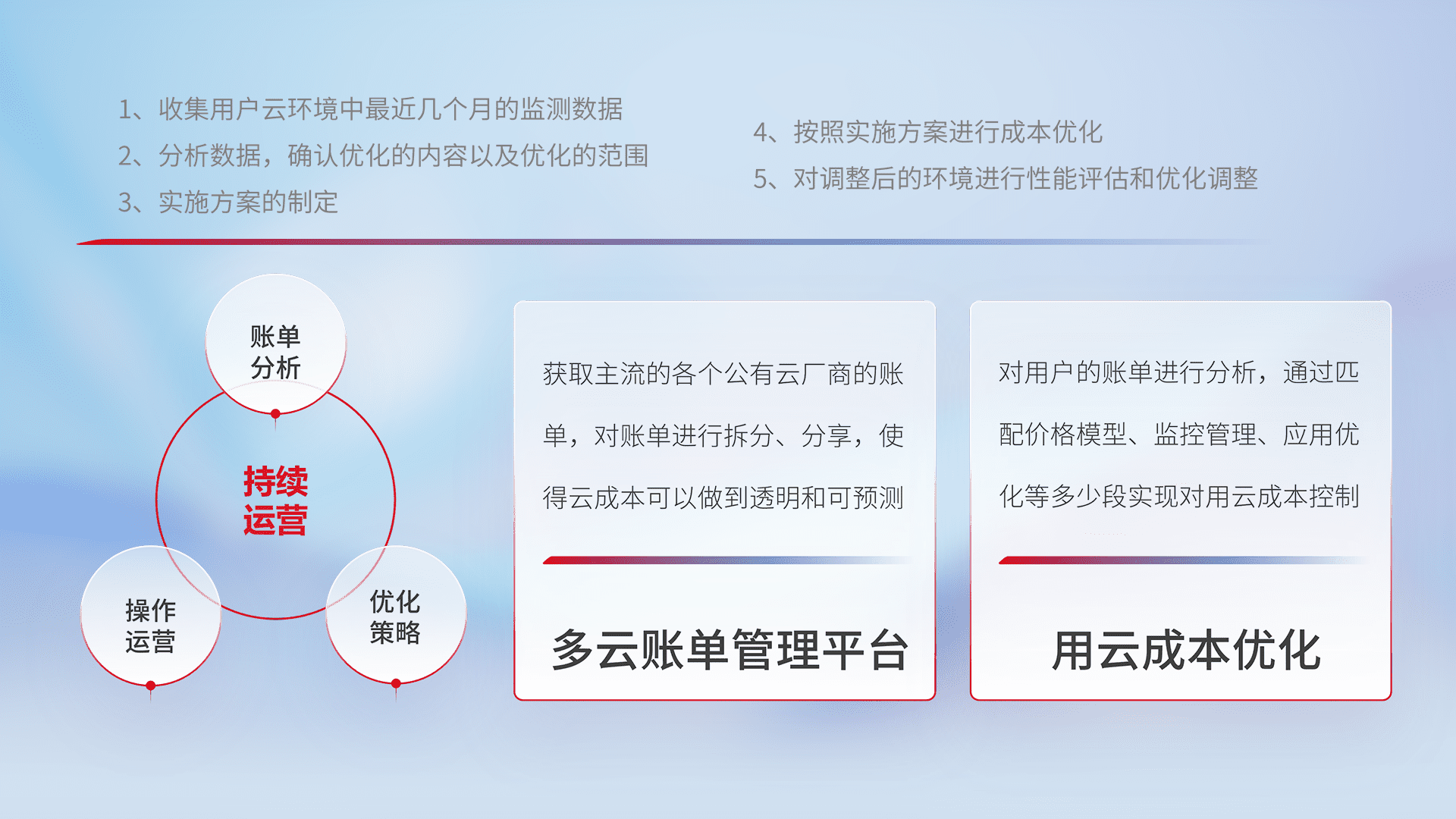 通过多云纳管,,以统一的资源数据模型把客户的云资源进行抽象和封装,,,进而实现对多云资源的统一操作,,,保障云资源管理的可靠性、、、稳定性与可用性。。。。量身定制化运维内容,,,,配置、、开发运维、、、补丁管理、、备份、、、监控、、、、认证和访问管理、、、审计和日常巡检等,,保障在用云过程中的可靠度,,,,稳定度以及高可用率。。