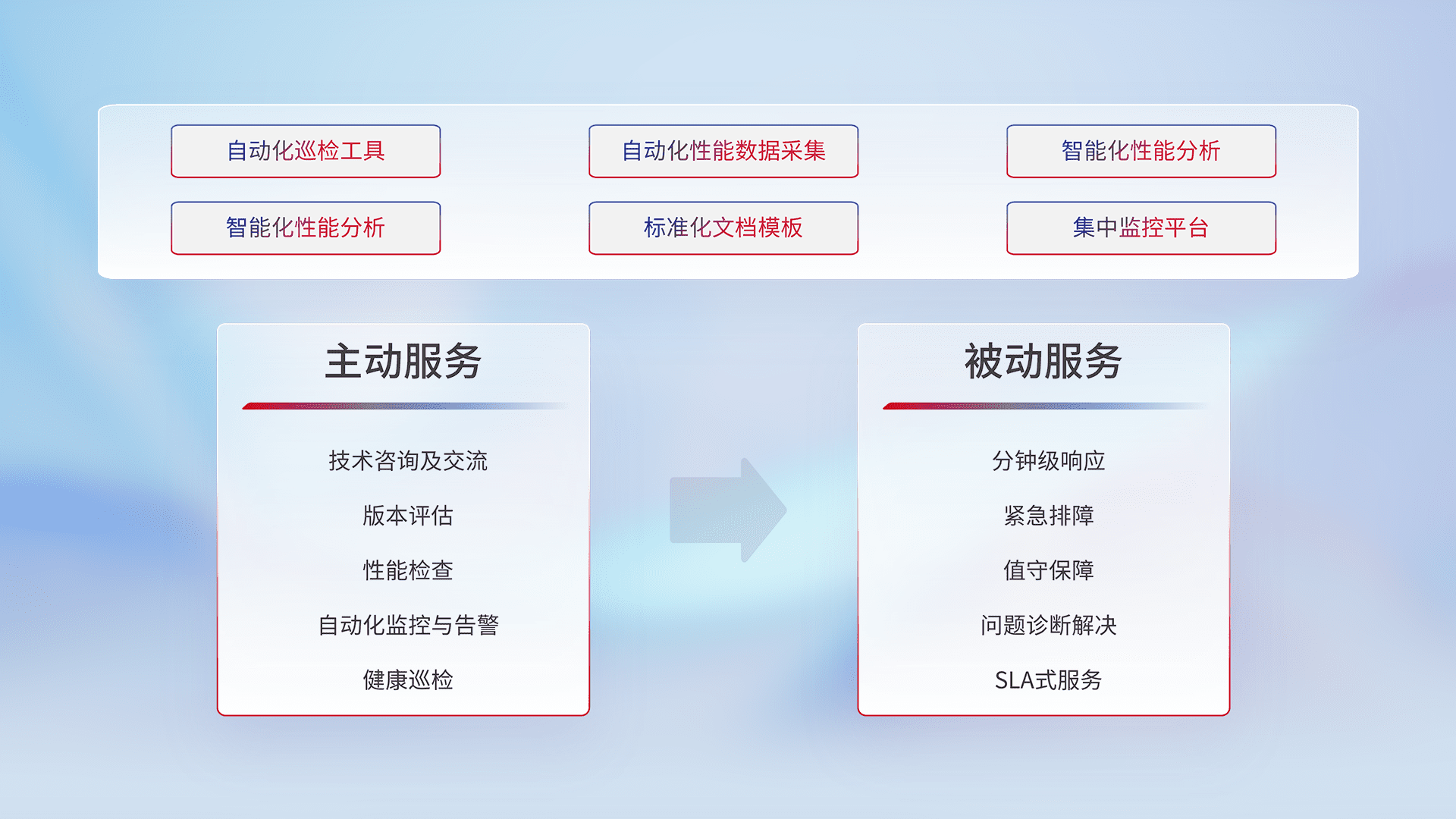 智能化工具和标准化文档,,,,保障服务质量,,提供主动服务(包含技术咨询、、、版本评估、、、性能检查、、、自动化监控与告警、、健康巡检)和被动服务包含(分钟级响应、、紧急排障、、值守保障、、、、问题诊断解决、、SLA服务)。。。。